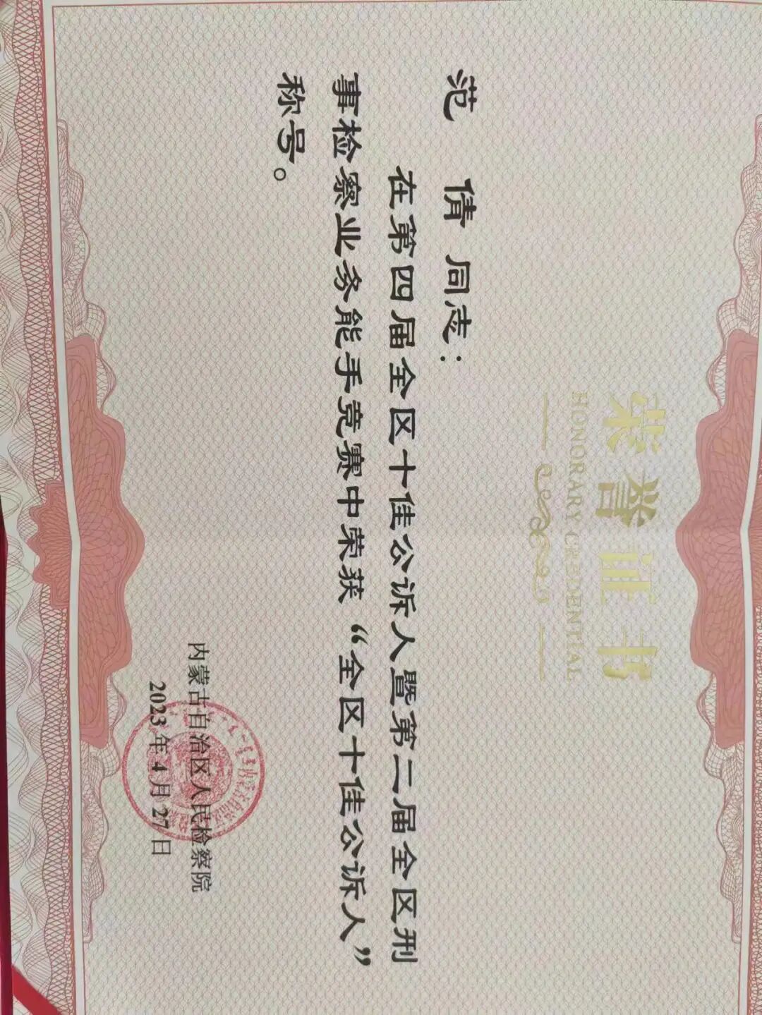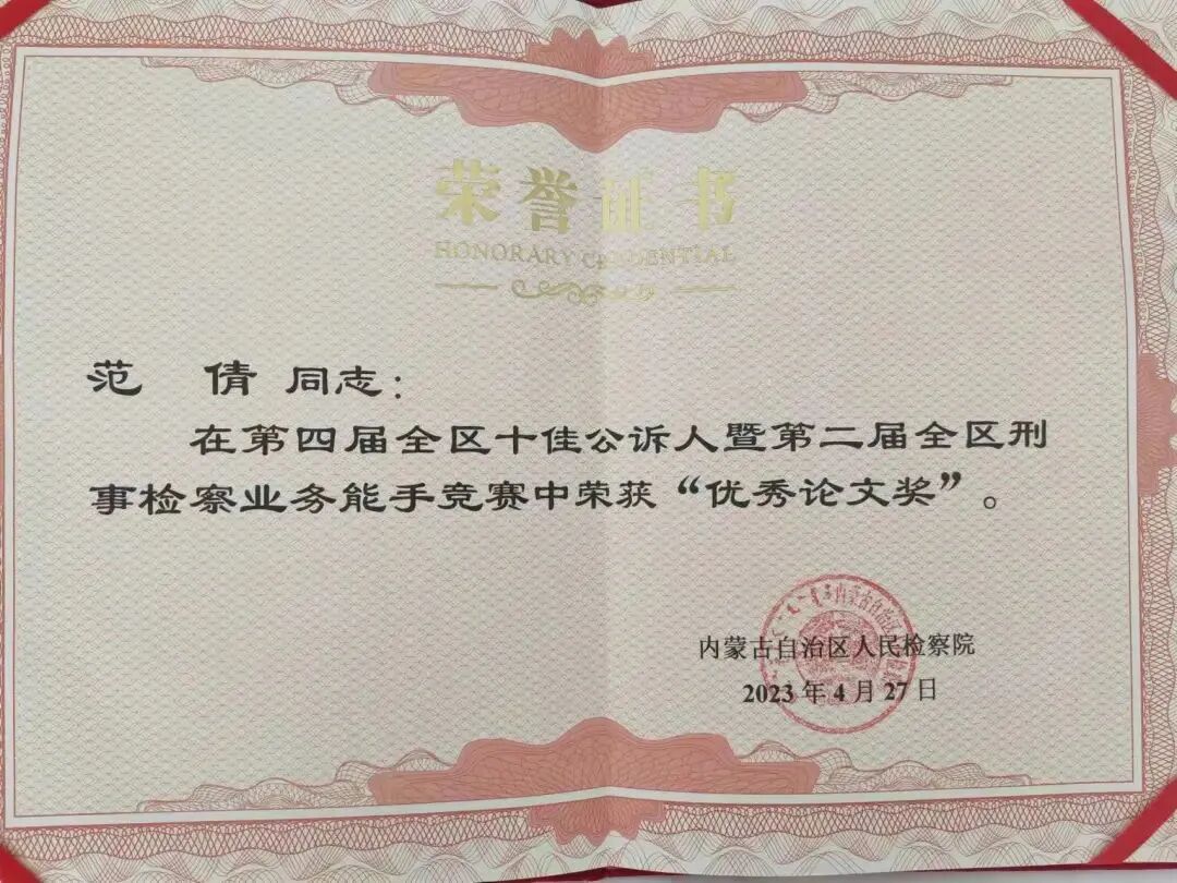 今年4月,范倩与其他5名优秀刑事检察业务骨干代表包头参加全区检察机关刑事检察业务竞赛。公诉人业务竞赛,对选手而言,既是脑力的考验,也是体力的比拼。为此,范倩用一个月的时间准备,翻阅练习近几年的刑事检察业务笔试,动手写3000字的策论写作,与同伴进行模拟法庭论辩。尤其在比赛前夕,熬夜一两点也是常有之事。经过一番充分的赛前准备、扎实的业务功底和优异的临场发挥,范倩顺利从全区12个盟市及地区检察院的55名选手中脱颖而出,荣获“全区十佳公诉人”。其撰写的论文也荣登榜首,获“优秀论文奖”。
