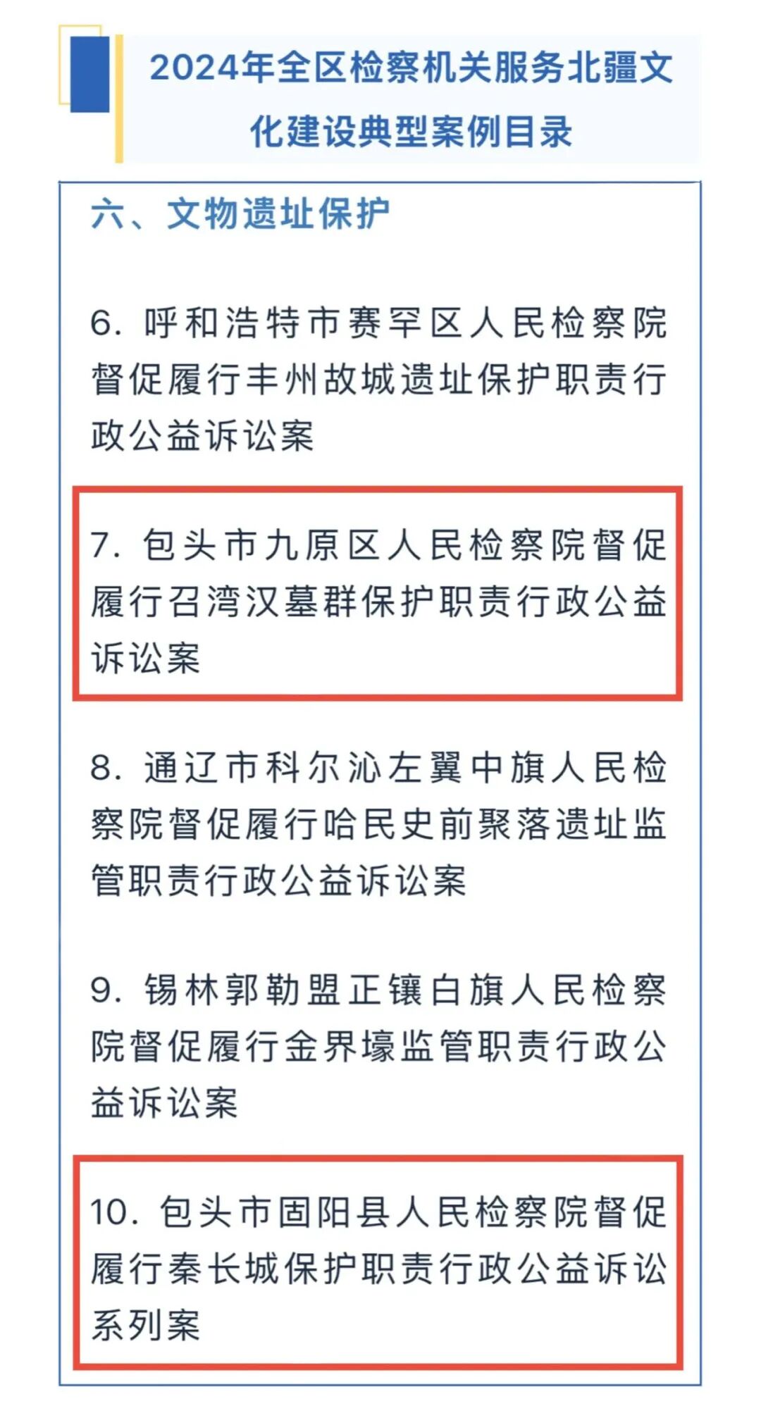 为深入学习贯彻习近平文化思想,进一步贯彻落实党的二十大有关“加大文物和文化遗产保护力度”和二十届三中全会“推动文化遗产系统性保护和统一监管”重要部署要求,着力服务新时代北疆文化建设,做实全区检察宣传思想文化工作“十项举措”,自治区检察院评选、发布服务北疆文化建设典型案例。其中,“包头市九原区人民检察院督促履行召湾汉墓群保护职责行政公益诉讼案”,“包头市固阳县人民检察院督促履行秦长城保护职责行政公益诉讼系列案”入选该批典型案例。