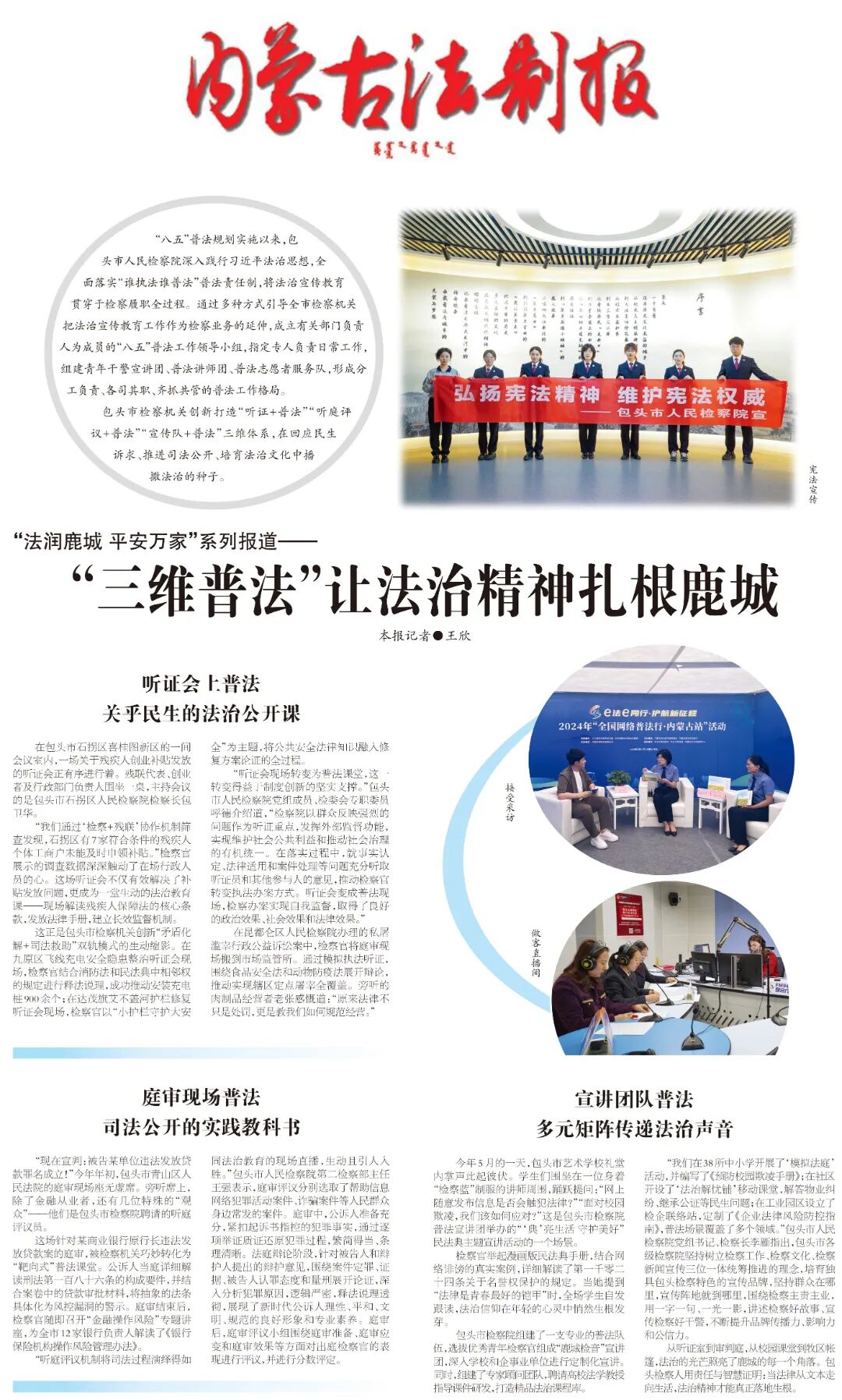 包头市检察机关创新打造“听证+普法”“听庭评议+普法”“宣传队+普法”三维体系,在回应民生诉求、推进司法公开、培育法治文化中播撒法治的种子。