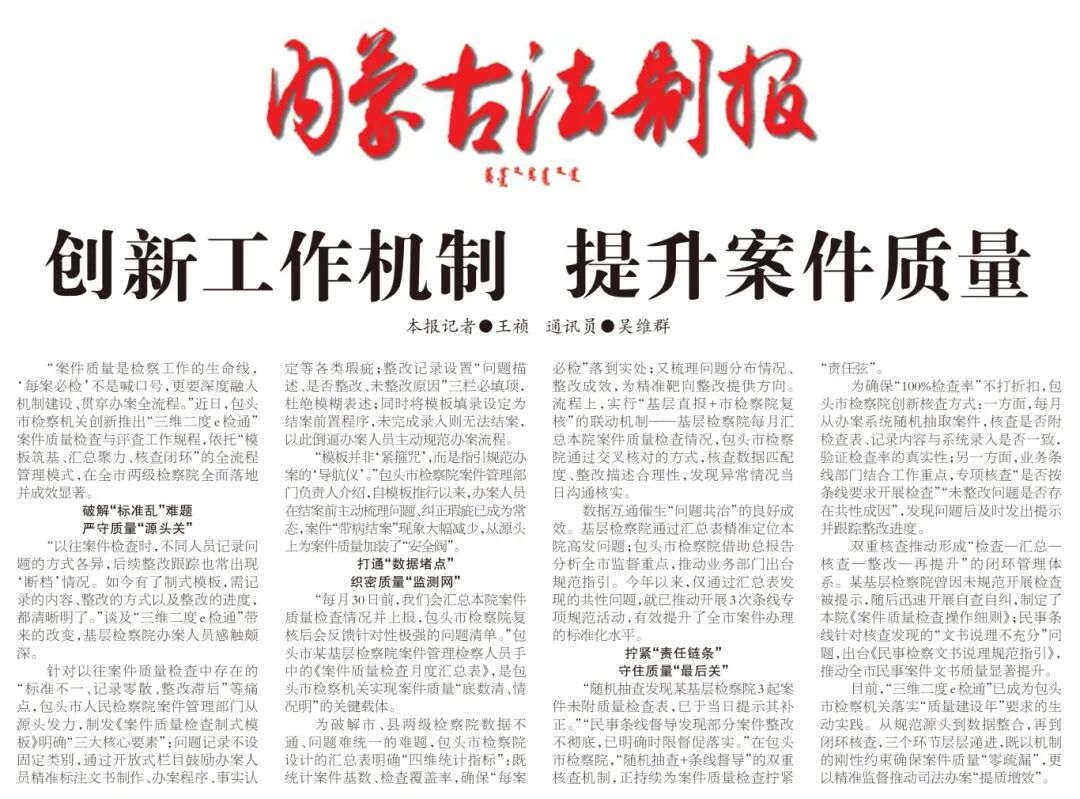 “案件质量是检察工作的生命线,‘每案必检’不是喊口号,更要深度融入机制建设、贯穿办案全流程。”近日,包头市检察机关创新推出“三维二度e检通”案件质量检查与评查工作规程,依托“模板筑基、汇总聚力、核查闭环”的全流程管理模式,在全市两级检察院全面落地并成效显著。