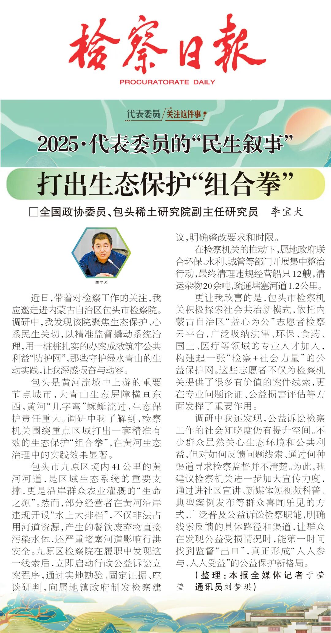 近日,带着对检察工作的关注,我应邀走进内蒙古自治区包头市检察院。调研中,我发现该院聚焦生态保护、心系民生关切,以精准监督撬动系统治理,用一桩桩扎实的办案成效筑牢公共利益“防护网”,那些守护绿水青山的生动实践,让我深感振奋与动容。