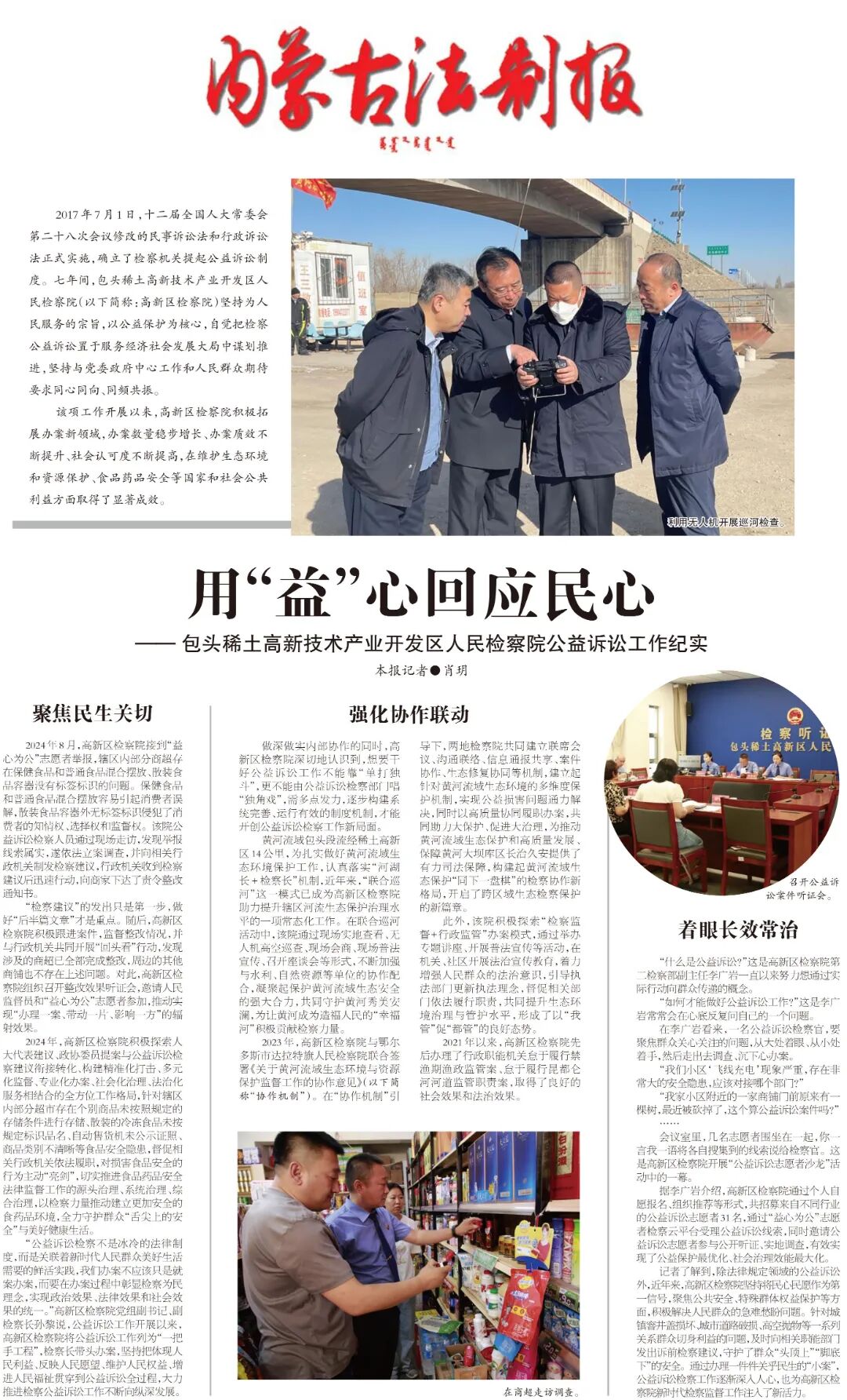 2017年7月1日,十二届全国人大常委会第二十八次会议修改的民事诉讼法和行政诉讼法正式实施,确立了检察机关提起公益诉讼制度。七年间,包头稀土高新技术产业开发区人民检察院(以下简称:高新区检察院)坚持为人民服务的宗旨,以公益保护为核心,自觉把检察公益诉讼置于服务经济社会发展大局中谋划推进,坚持与党委政府中心工作和人民群众期待要求同心同向、同频共振。
