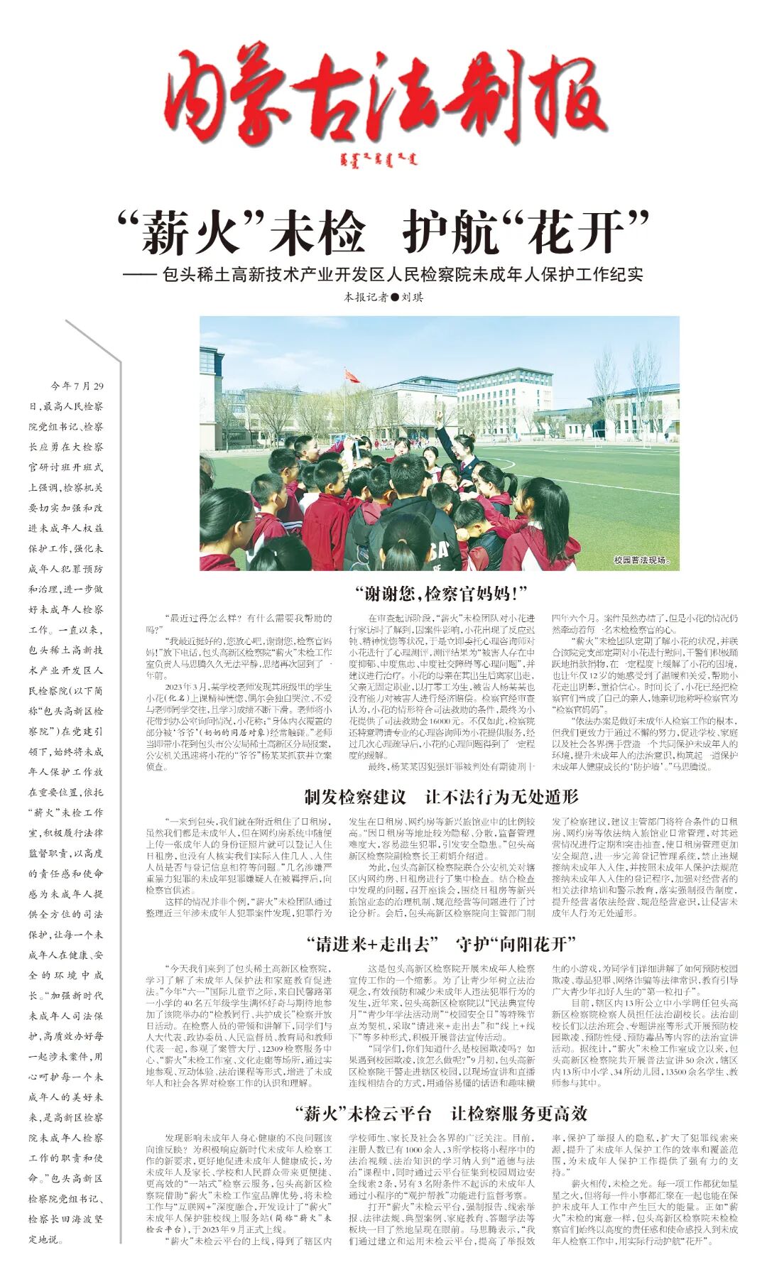 薪火相传,未检之光。每一项工作都犹如星星之火,但将每一件小事都汇聚在一起也能在保护未成年人工作中产生巨大的能量。正如“薪火”未检的寓意一样,包头高新区检察院未检检察官们始终以高度的责任感和使命感投入到未成年人检察工作中,用实际行动护航“花开”。