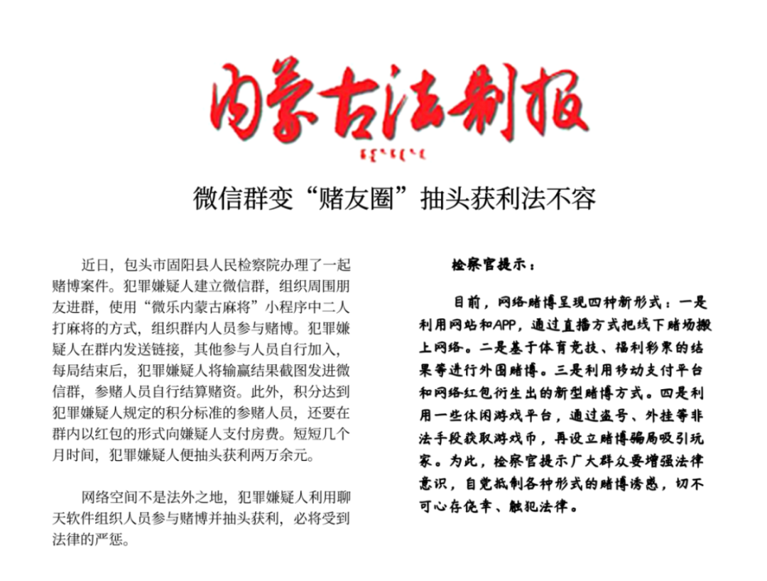 近日,包头市固阳县人民检察院办理了一起赌博案件。犯罪嫌疑人建立微信群,组织周围朋友进群,使用“微乐内蒙古麻将”小程序中二人打麻将的方式,组织群内人员参与赌博。犯罪嫌疑人在群内发送链接,其他参与人员自行加入,每局结束后,犯罪嫌疑人将输赢结果截图发进微信群,参赌人员自行结算赌资。此外,积分达到犯罪嫌疑人规定的积分标准的参赌人员,还要在群内以红包的形式向嫌疑人支付房费。短短几个月时间,犯罪嫌疑人便抽头获利两万余元。