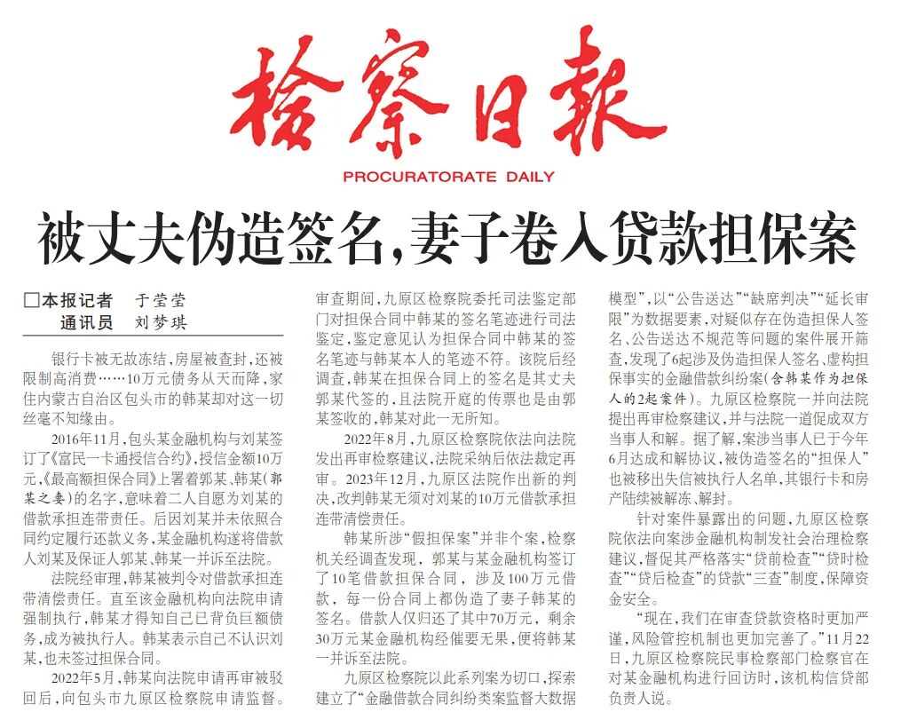 “现在,我们在审查贷款资格时更加严谨,风险管控机制也更加完善了。”11月22日,九原区检察院民事检察部门检察官在对某金融机构进行回访时,该机构信贷部负责人说。