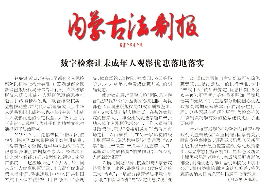 近日,包头市昆都仑区检察院以数字检察为突破口,联动昆都仑区新闻出版版权局开展专项行动,成功破解影院未落实未成年人观影优惠的民生难题,用“线索精准发现-联合核查核实-监督推动整改”的闭环治理模式,让《中华人民共和国未成年人保护法》中关于未成年人观影优惠的法定权益,从“纸面上”真正走进“实践中”,为孩子们的精神文化生活撑起了法治晴空。
