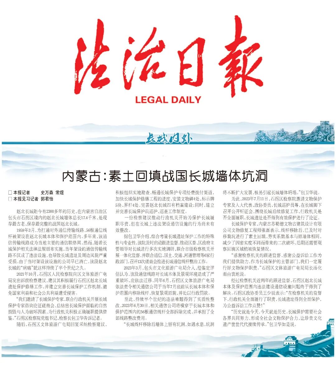 “我们邀请了长城保护专家,联合行政机关开展长城保护专家咨询论证磋商会,总结出长城保护面临的自然损毁与人为破坏因素,为行政机关积极正确履职提供借鉴。”石拐区检察院党组书记、检察长包卫华告诉记者。
