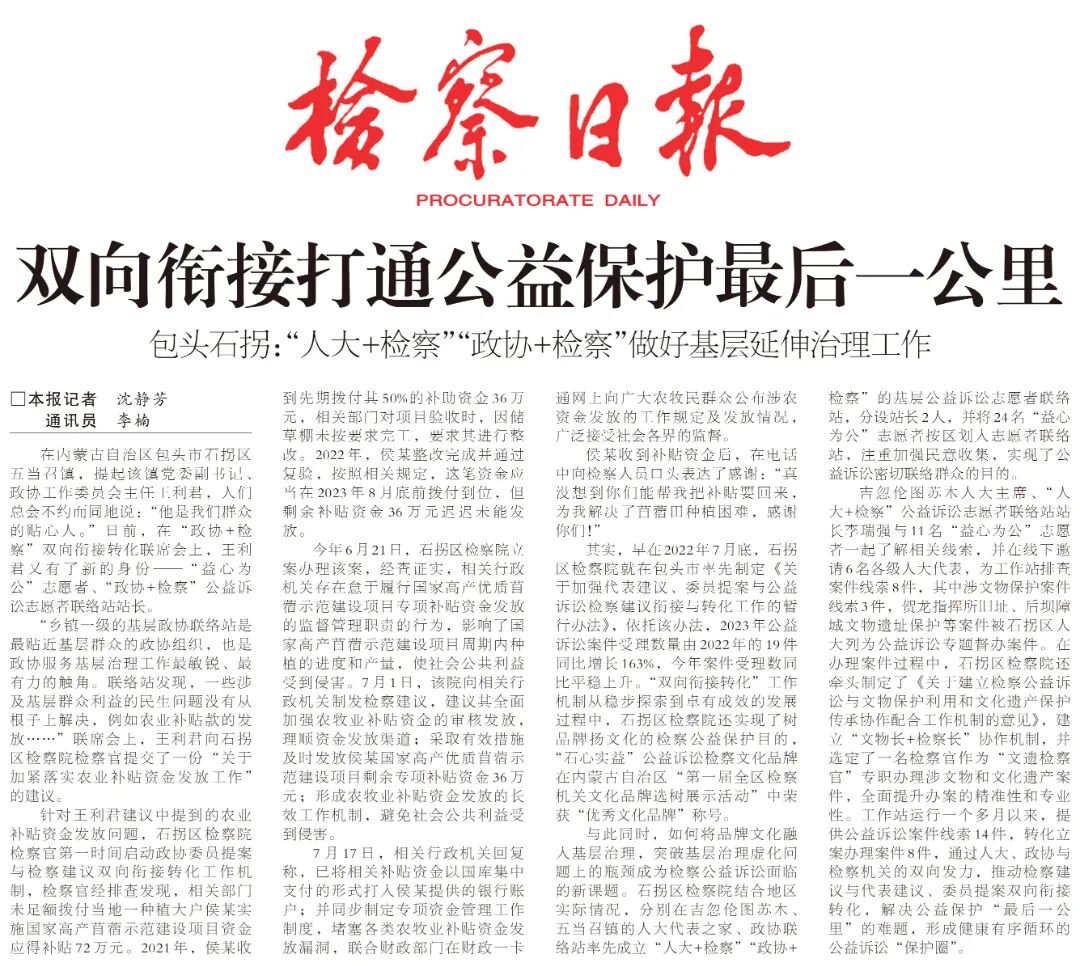 吉忽伦图苏木人大主席、“人大+检察”公益诉讼志愿者联络站站长李瑞强与11名“益心为公”志愿者一起了解相关线索,并在线下邀请6名各级人大代表,为工作站排查案件线索8件,其中涉文物保护案件线索3件,贺龙指挥所旧址、后坝障城文物遗址保护等案件被石拐区人大列为公益诉讼专题督办案件。在办理案件过程中,石拐区检察院还牵头制定了《关于建立检察公益诉讼与文物保护利用和文化遗产保护传承协作配合工作机制的意见》,建立“文物长+检察长”协作机制,并选定了一名检察官作为“文遗检察官”专职办理涉文物和文化遗产案件,全面提升办案的精准性和专业性。工作站运行一个多月以来,提供公益诉讼案件线索14件,转化立案办理案件8件,通过人大、政协与检察机关的双向发力,推动检察建议与代表建议、委员提案双向衔接转化,解决公益保护“最后一公里”的难题,形成健康有序循环的公益诉讼“保护圈”。