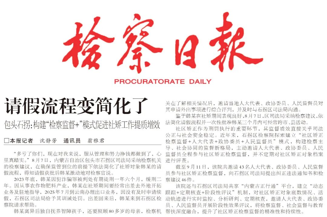 “多亏了你们,现在对我来说,服从管理和努力挣钱都做到了,心里真踏实。”8月7日,内蒙古自治区包头市石拐区司法局采纳检察机关的检察建议,在确保监管到位的前提下依法简化了社矫对象韩某的请假流程,得知请假获批后韩某激动地对检察官说。