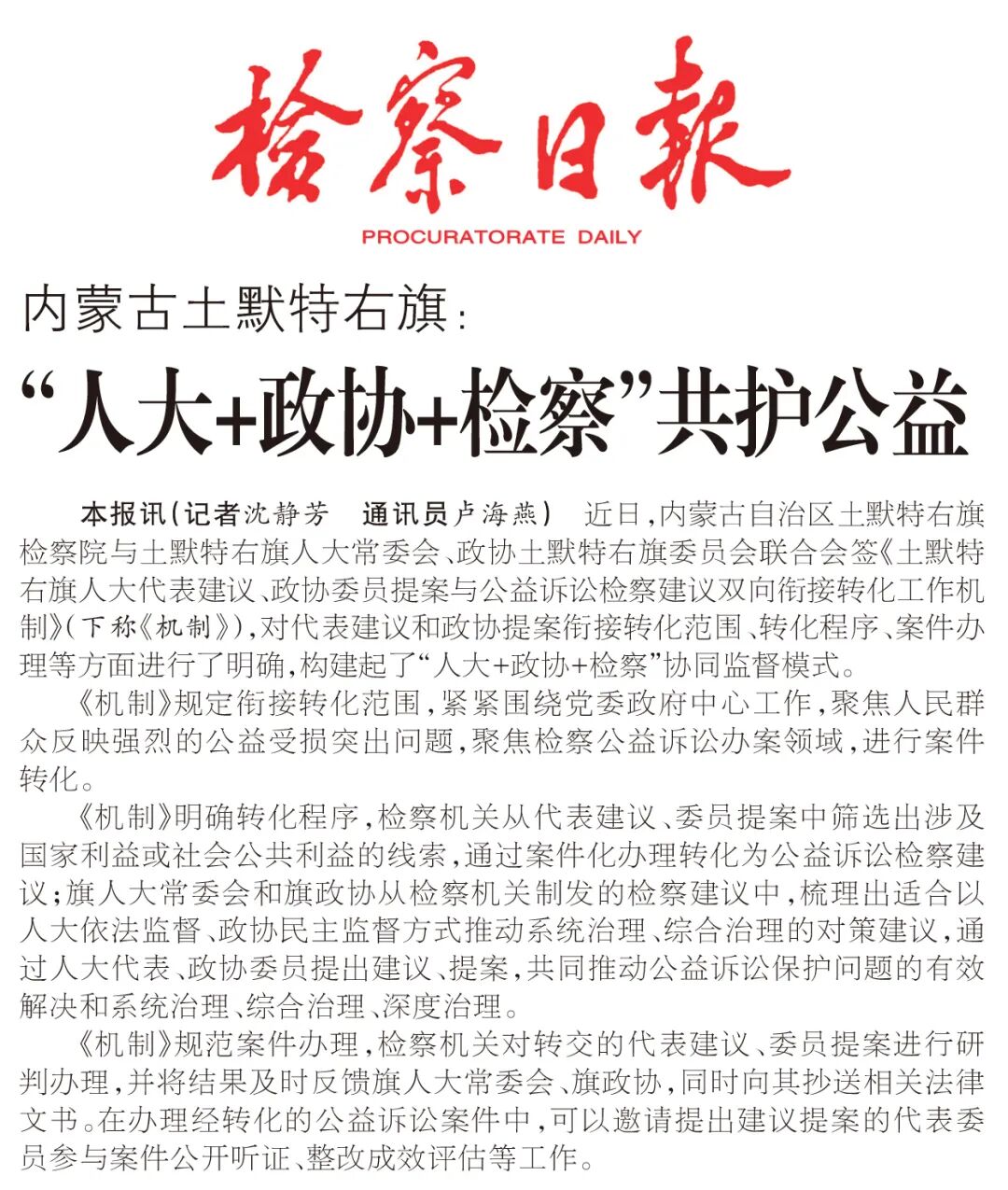 近日,内蒙古自治区土默特右旗检察院与土默特右旗人大常委会、政协土默特右旗委员会联合会签《土默特右旗人大代表建议、政协委员提案与公益诉讼检察建议双向衔接转化工作机制》(下称《机制》),对代表建议和政协提案衔接转化范围、转化程序、案件办理等方面进行了明确,构建起了“人大+政协+检察”协同监督模式。