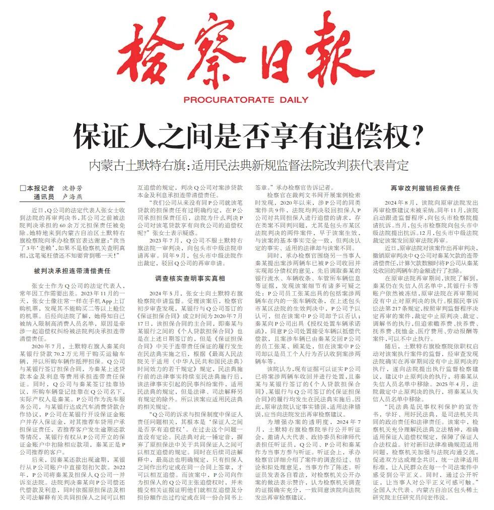 “Q公司的诉求与担保制度中保证人责任问题相关,其根本是‘保证人之间是否享有追偿权’。在过去这个问题一直没有定论。民法典对此一锤定音,摒弃了原担保法中关于共同保证人之间可以相互追偿的规定。同时在后续司法解释中,最高法也明确规定,只有担保人之间作出约定或在同一合同上签章,才可以相互追偿。而该案中,P公司向作为担保人的Q公司主张追偿权时,并未提交相关证据证明他们就相互追偿及分担份额作出过约定或在同一份合同书上签章。”承办检察官告诉记者。